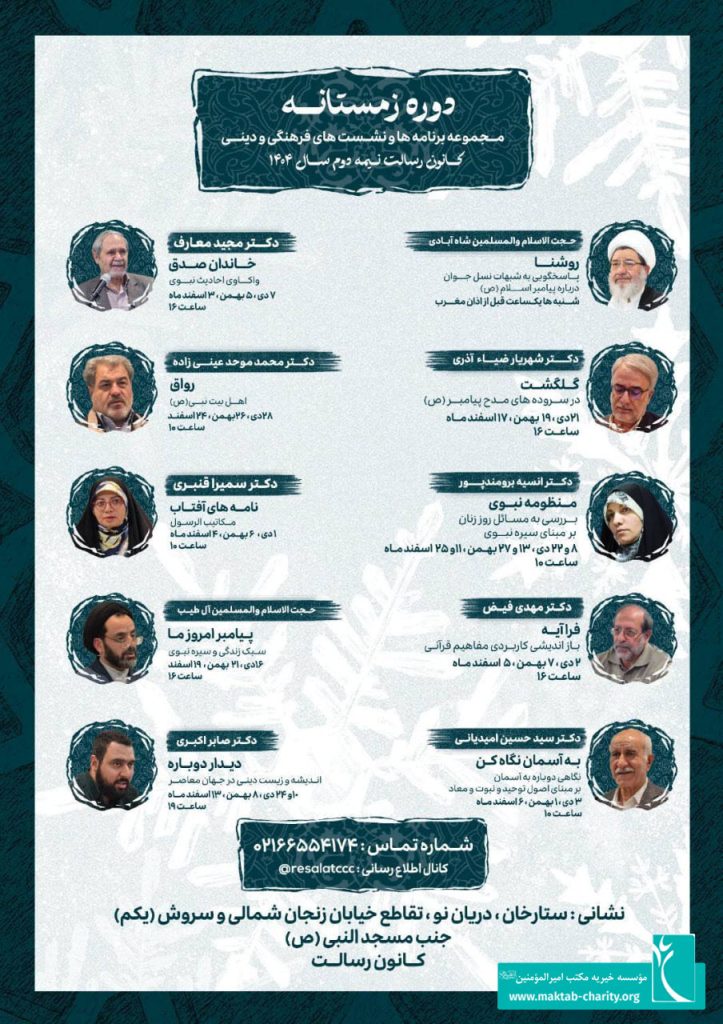 به گزارش روابطعمومی مؤسسه خیریه مکتب امیرالمؤمنین (ع)، این نشستها در قالب دوره زمستان و با حضور استادان حوزه و دانشگاه برگزار میشود. برنامهها به شرح زیر است: