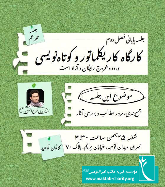 جلسه پایانی فصل دوم کارگاه کاربردی «کوتاهنویسی» روز شنبه ۲۵ بهمنماه ساعت ۱۶:۳۰ در کانون فرهنگی توحید برگزار میشود.