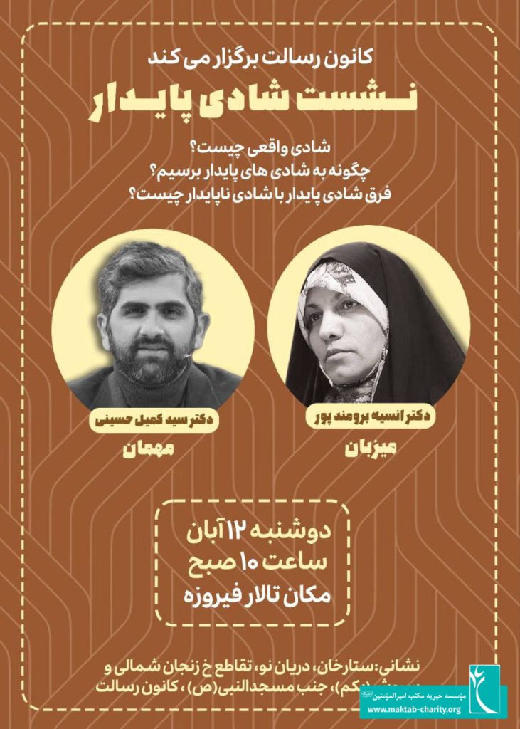 به گزارش روابطعمومی مؤسسه خیریه مکتب امیرالمؤمنین (ع)، این برنامه با میزبانی دکتر انسیه برومندپور و حضور دکتر سید کمیل حسینی بهعنوان کارشناس مهمان برگزار خواهد شد. محور نشست بررسی راهکارهای علمی و تربیتی برای تقویت نشاط، آرامش و کیفیت زندگی در خانواده است. مخاطبان اصلی این برنامه والدین و خانوادههایی هستند که به دنبال ایجاد فضایی شاد و متعادل در خانهاند.