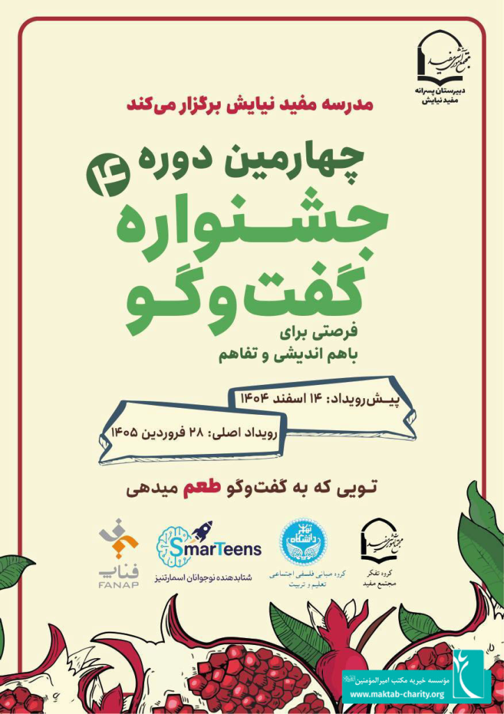 چهارمین دوره جشنواره گفت‌وگو به همت دبیرستان پسرانه مفید نیایش و با هدف تقویت مهارت گفت‌وگو، هم‌اندیشی و تفاهم میان دانش‌آموزان برگزار می‌شود.