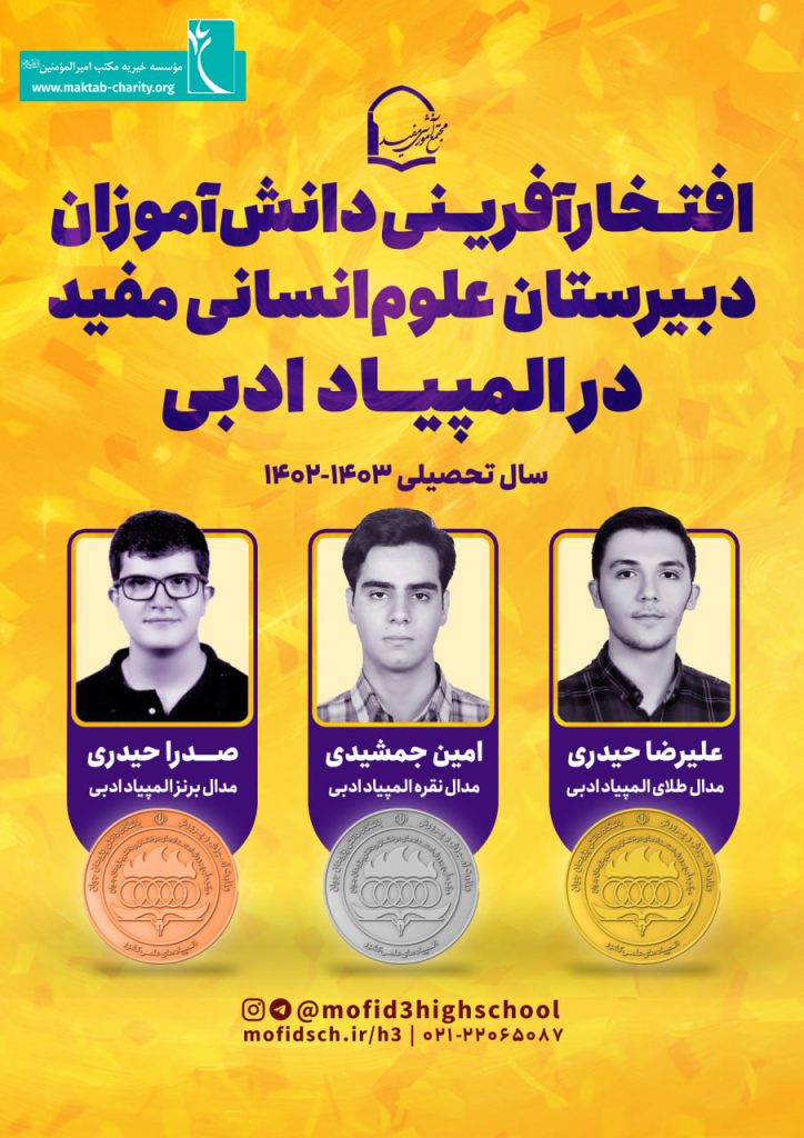 دانشآموز دبیرستان علوم انسانی مفید در مرحلهٔ نهایی المپیاد ادبی کشور به مدال نقره دست یافت. مدرسه پیشتر در سال ۱۴۰۴ نیز سه مدال طلا، نقره و برنز این رشته را کسب کرده بود.
