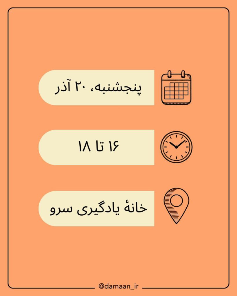 نشست در خانه یادگیری سرو واقع در ایستگاه متروی دانشگاه شریف، خیابان همایونشهر جنوبی، کوچه ارکیده چهارم، پلاک ۲، طبقه سوم برگزار میشود. معلمان علاقهمند برای ثبتنام میتوانند از طریق شناسه @damaan_admin اقدام کنند.