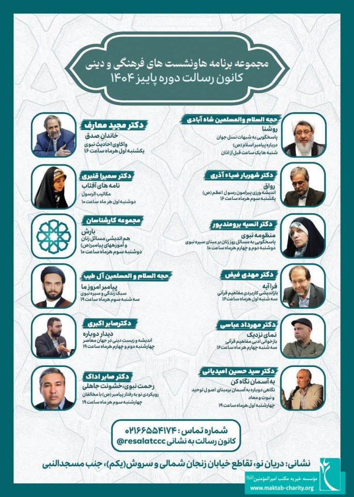 کانون فرهنگی رسالت از مراکز فعال وابسته به مؤسسه خیریه مکتب امیرالمؤمنین (ع) است که با برگزاری نشستهای آموزشی و گفتوگومحور دینی، به ترویج معارف اسلامی و پاسخگویی به پرسشهای روز جامعه میپردازد. مجموعه نشستهای پاییز ۱۴۰۴ در ادامه این رویکرد و با تمرکز بر تبیین سیره پیامبر اسلام (ص) برنامهریزی شده است.