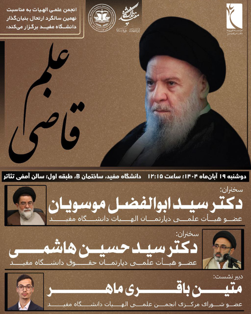 انجمن علمی الهیات دانشگاه مفید به مناسبت نهمین سالگرد ارتحال حضرت آیتاللهالعظمی سید عبدالکریم موسوی اردبیلی (ره)، بنیانگذار دانشگاه مفید، نشست علمی با عنوان «علم قاضی» را برگزار میکند.