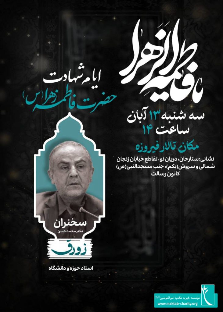 به گزارش روابطعمومی مؤسسه خیریه مکتب امیرالمؤمنین (ع)، این برنامه با هدف گرامیداشت یاد و منزلت بانوی بزرگ اسلام و بهرهمندی از معارف فاطمی برگزار خواهد شد. در این محفل، مخاطبان ضمن شنیدن سخنان دکتر زورق درباره جایگاه علمی، معنوی و اجتماعی حضرت زهرا (س)، به تأمل در ابعاد شخصیتی ایشان در تاریخ اسلام خواهند پرداخت.