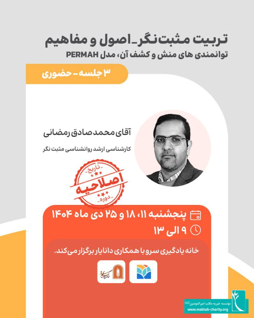 خانه یادگیری سرو با همکاری مجموعه دانایار دوره آموزشی «تربیت مثبتنگر – اصول و مفاهیم» را در دیماه برگزار میکند. به گزارش روابطعمومی مؤسسه خیریه مکتب امیرالمؤمنین (ع)، این دوره در سه جلسه روزهای پنجشنبه ۱۱، ۱۸ و ۲۵ دیماه از ساعت ۹ تا ۱۳ برگزار خواهد شد و محور آن آشنایی معلمان و مربیان […]