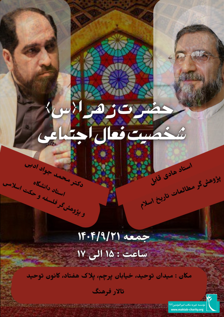 نشست علمی با موضوع «حضرت زهرا (س)، شخصیت فعال اجتماعی» روز جمعه ۲۱ آذر ۱۴۰۴ از ساعت ۱۵ تا ۱۷ در تالار فرهنگ کانون توحید برگزار خواهد شد. به گزارش روابطعمومی مؤسسه خیریه مکتب امیرالمؤمنین (ع)، در این برنامه استاد هادی قابل، پژوهشگر مطالعات تاریخ اسلام، و دکتر محمدجواد ادبی، استاد دانشگاه و پژوهشگر فلسفه […]