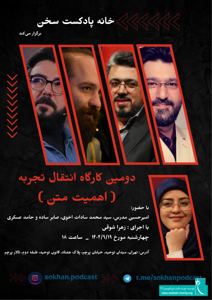 خانه پادکست سخن با همکاری کانون فرهنگی توحید دومین کارگاه انتقال تجربه خود را با موضوع «اهمیت متن» برگزار میکند. به گزارش روابطعمومی مؤسسه خیریه مکتب امیرالمؤمنین (ع)، این برنامه روز چهارشنبه ۱۹ آذر ۱۴۰۴ ساعت ۱۸ در تالار پرچم کانون توحید برگزار خواهد شد و جمعی از چهرههای حوزه ادبیات و رسانه از جمله […]
