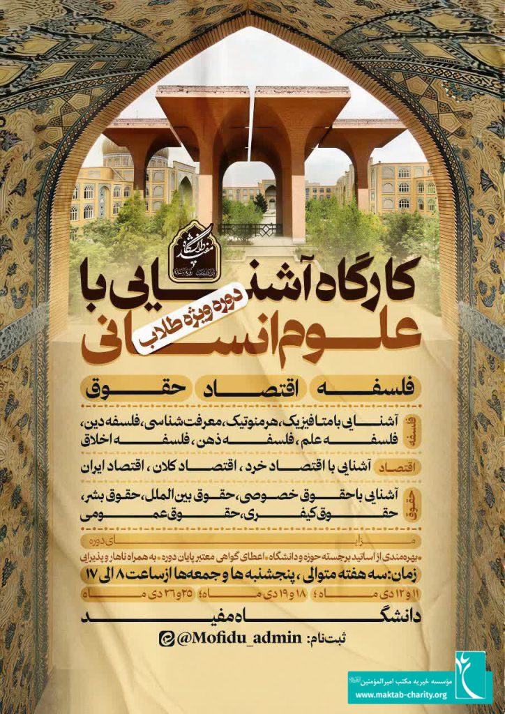دانشگاه مفید کارگاه سههفتهای «آشنایی با علوم انسانی» را با هدف ارتقای سطح علمی طلاب و تقویت گفتوگوی میان حوزه و دانشگاه برگزار میکند. به گزارش روابطعمومی مؤسسه خیریه مکتب امیرالمؤمنین (ع)، این دوره شامل مباحث مقدماتی در سه شاخه اصلی علوم انسانی است: این کارگاه در روزهای پنجشنبه و جمعه به تاریخهای ۱۱ و […]
