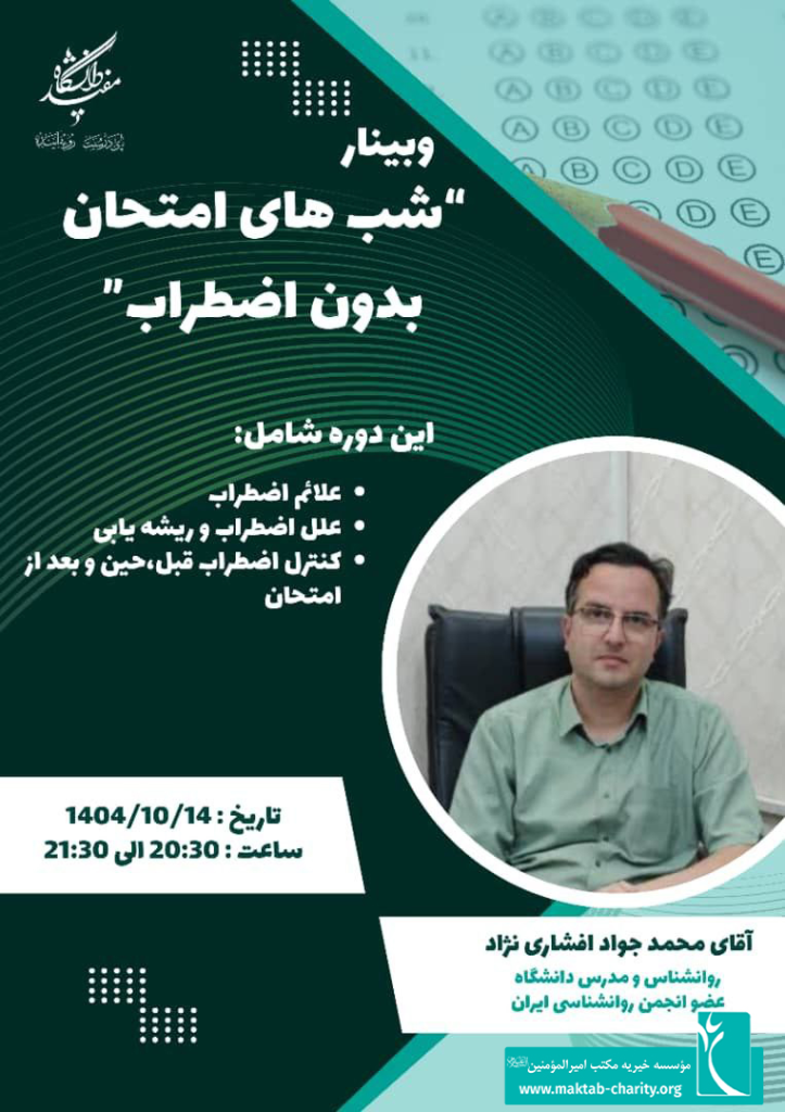 مرکز مشاوره دانشگاه مفید وبینار آموزشی با عنوان «شبهای امتحان بدون اضطراب» را بهصورت مجازی برگزار میکند. به گزارش روابطعمومی مؤسسه خیریه مکتب امیرالمؤمنین (ع)، این وبینار روز یکشنبه ۱۴ دیماه ۱۴۰۴ از ساعت ۲۰:۳۰ تا ۲۱:۳۰ برگزار خواهد شد و محمدجواد افشارینژاد، مدرس دانشگاه و عضو انجمن روانشناسی ایران، بهعنوان مدرس در آن حضور […]