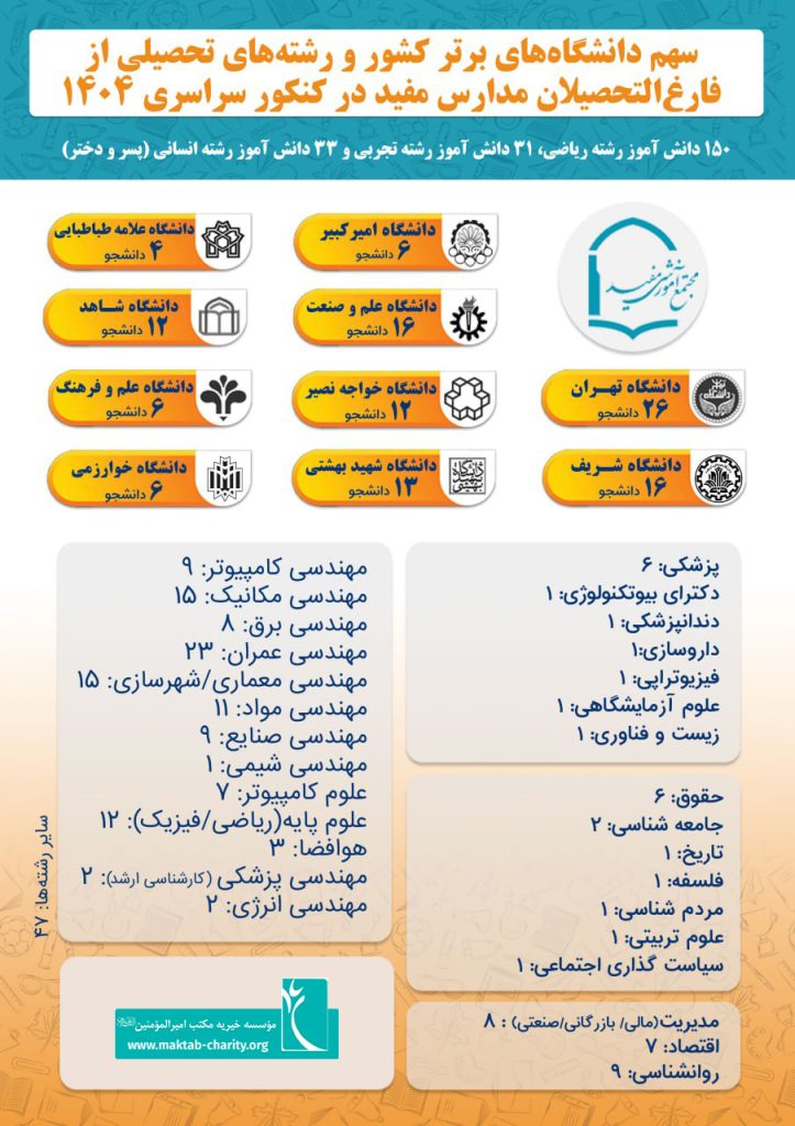 با اعلام نتایج کنکور سراسری ۱۴۰۴، بیش از ۲۱۰ نفر از فارغالتحصیلان مدارس مفید در رشتهها و دانشگاههای تراز اول کشور پذیرفته شدند. دانشگاه تهران، صنعتی شریف، علم و صنعت و امیرکبیر در صدر مقاصد تحصیلی این دانشآموزان قرار دارند. به گزارش روابطعمومی مؤسسه خیریه مکتب امیرالمؤمنین(ع)، مجموعاً ۱۵۰ دانشآموز رشته ریاضی، ۳۱ دانشآموز رشته […]